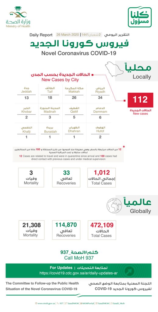 و ز ا ر ة ا لـ صـ حـ ة السعودية On Twitter الصحة تعلن عن تسجيل 2532 حالة إصابة جديدة بفيروس كورونا الجديد كوفيد19 وتسجيل 12 حالات وفيات رحمهم الله وتسجيل