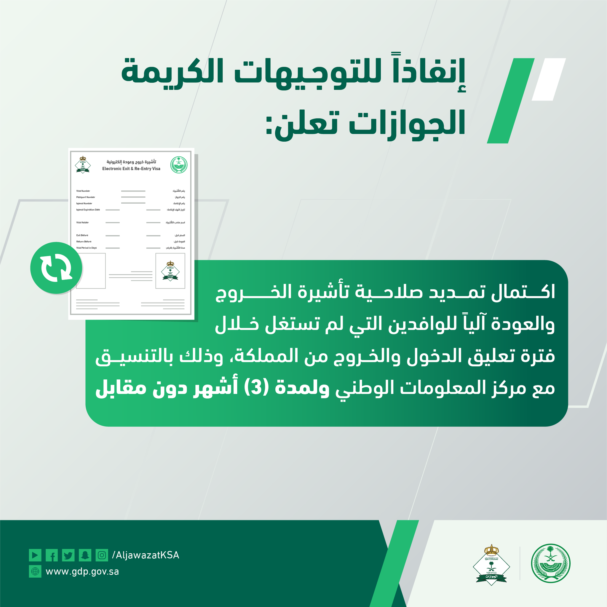تمديد تأشيرات الخروج والعودة وتوضيح هام من الجوزات السعودية