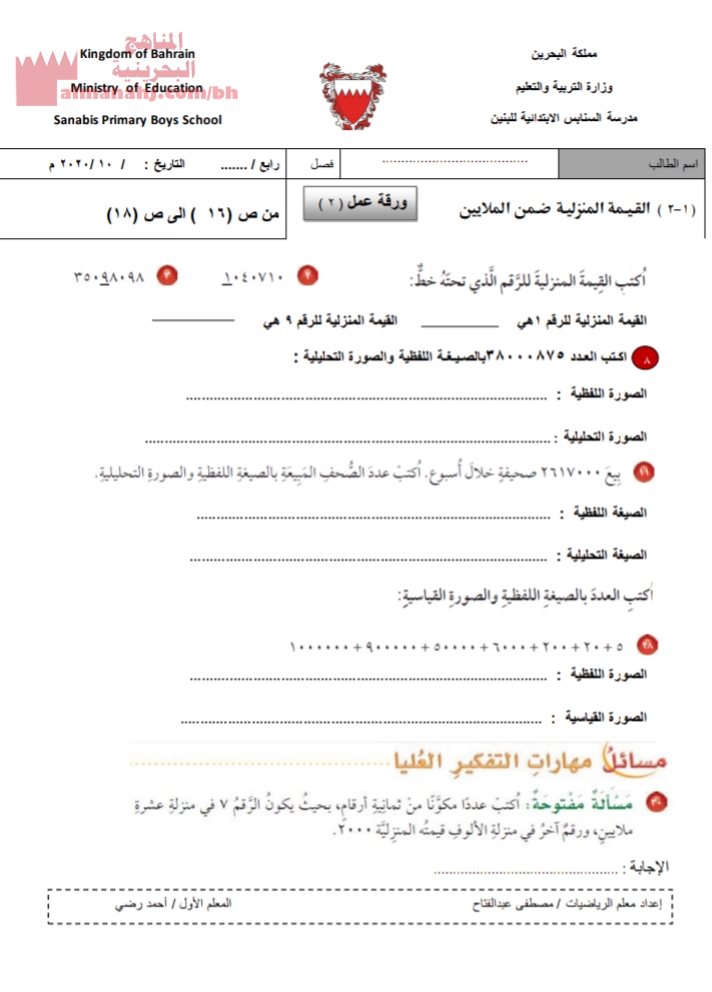 ورقة عمل 2 القيمة المنزلية ضمن الملايين الصف الرابع رياضيات الفصل الأول المناهج البحرينية